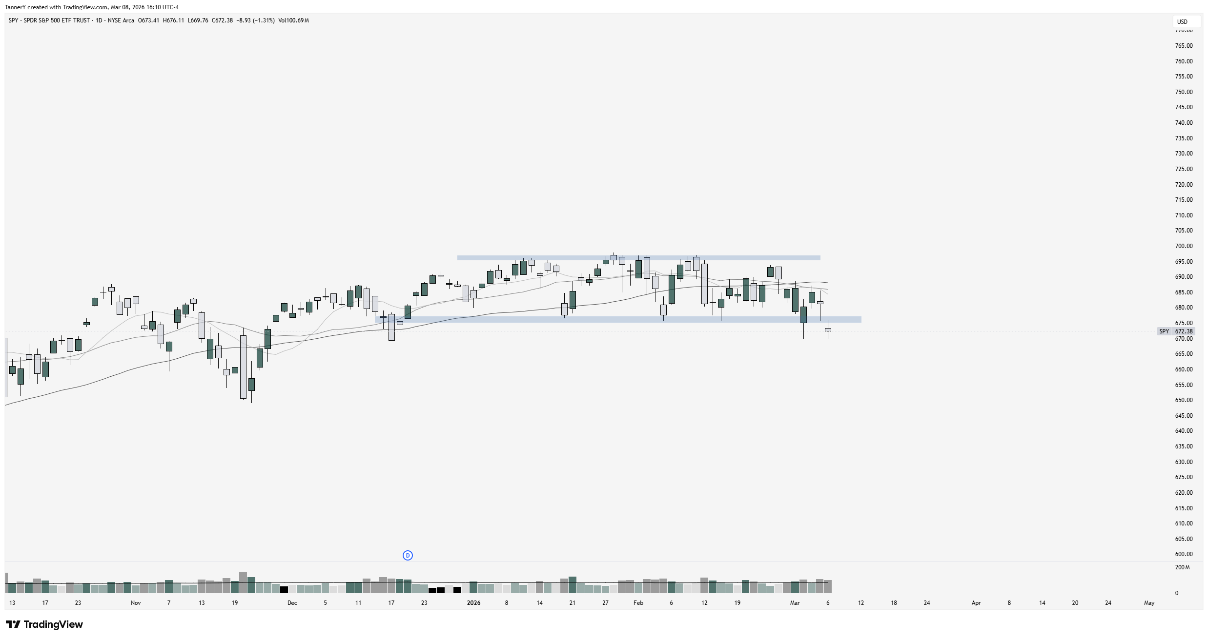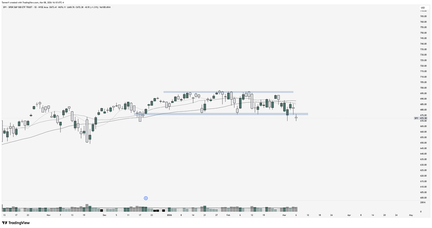 Hello and welcome back to another Weekly Selection Newsletter. this publication has been pretty quiet over the last few weeks, as I recognize that the price action really just is not all that great. Many of my new adds have been getting stopped, and the names I’ve had for a while are fading back into ranges or lower supports. I was under the impression that a bounce to the range support on SPY would hold, but that became untrue as the week unfurled, with price closing lower to end the session. See below: