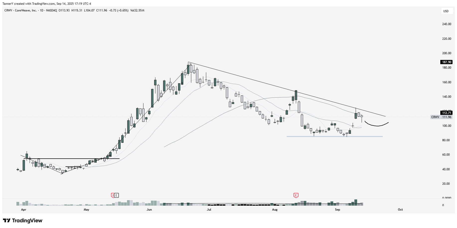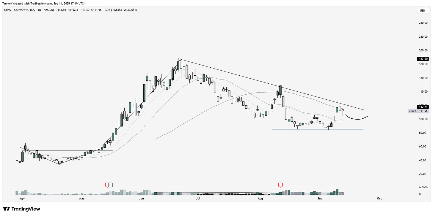 In the datacenters group, CRWV 0.00%↑ is best in class, or rather has the potential to be the best. Note the double bottom around $86 giving us a line in the sand. That, coupled with the potential higher low over the next couple weeks, could make for a great entry. The main peer NBIS 0.00%↑ gapping to highs, looking to continue as well.