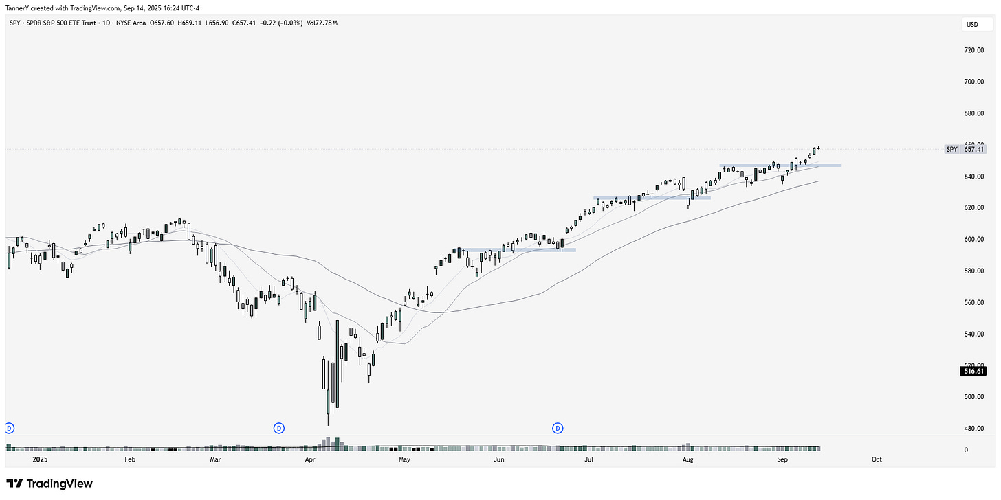 Quick look at SPY 0.00%↑ above. Very clean, linear price action out of the April lows, with minimal trickery around the SMAs… smooth sailing.