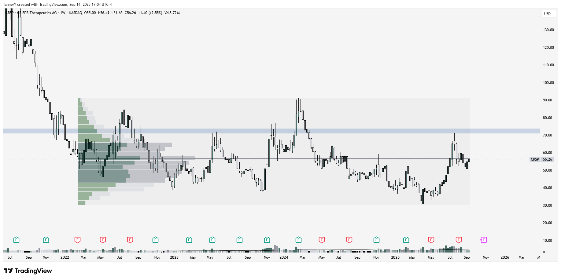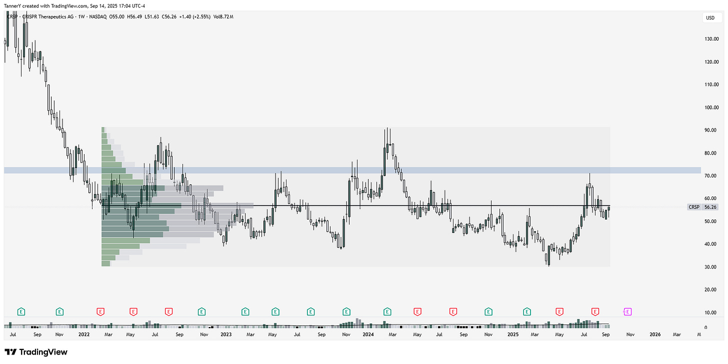 CRSP 0.00%↑ appears ripe for a nice tide shift in its current action. It has been flat for over 3 years, and has historically benefitted from a relaxed rate environment as well as deregulated industry. as it stands, none of its peers are notable, but in an adjacent indsutry, TEM 0.00%↑ is breaking out to all time highs and is notably active.